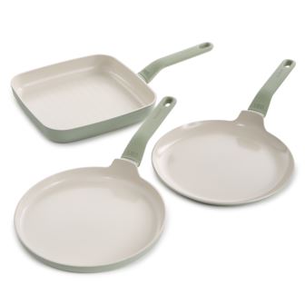 Leo Balance 3pc specialty cookware set offers a range of cooking options and is designed to make your cooking experience enjoyable and hassle-free. With its 100% recycled Aluminum body, the sturdy stay-cool handle is soft to the touch and provides a good grip so you can safely take the pan from the stove to the table for serving. Each piece is layered with sustainable and healthy non-toxic, PTFE free, PFAS free non-stick CeraGreen ceramic coating for no oil, no fat cooking. Its full disk bottom guarantees fast and even heat distribution for energy efficiency. Suitable with a wide range of cooktops like induction, electric, gas, halogen, vitro-ceramic, and downdraft. Package includes pancake pan 10.25", grill pan 10", and omelet pan 10". Available in Moonmist or Sage.