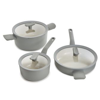 Stewing apples for a crumble, whisking up a delicious sauce or cooking rice for two, whatever you've got planned, BergHOFF's Leo Balance 6pc cookware set is always ready to do their part. With its 100% recycled Aluminum body and full disk bottom that guarantee fast and even heat distribution for energy efficiency, this set is suitable for all cooktops. Each piece is coated with sustainable and healthy non-toxic, PTFE free, PFAS free non-stick CeraGreen ceramic coating for no oil, no fat cooking. The sturdy stay-cool handle that's soft to the touch provides a good grip so you can safely take the pan from the stove to the table for serving. The glass lid allows you to keep an eye on your cooking without having to lift the lid. On top of that, the knob on the lid is equipped with a spoon rest to keep your kitchen clean while cooking. This set includes Covered Saucepan 7", Covered Stockpot 4.6qt., and Covered Sauté Pan 3.1qt. Available in Sage or Moonmist.