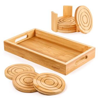 8pc Set, a stylish and practical addition to your home decor. Crafted from high-quality bamboo, this set is not only eco-friendly but also durable and long-lasting. The natural bamboo finish adds a touch of elegance to any table setting, making it suitable for both casual and formal occasions. Its eco-friendly material, durable construction, and stylish design make it a must-have for any home. Whether you are hosting a party or simply enjoying a quiet evening at home, this serving tray set will enhance your dining experience and impress your guests with its functionality and beauty. Set includes: 6x Coasters, coaster holder and 12" tray