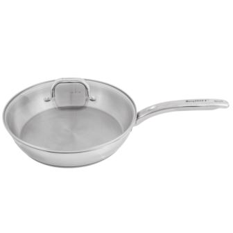 BergHOFF's Belly Shape Skillet is made from hygienic 18/10 stainless steel with a mirrored finish, this cookware shows off sleek curves that accent each piece giving this cookware a unique and attractive look. This skillet can be used for a variety of meals. Braise carrots, sauté chicken, pan sear tuna or make your favorite risotto with ease thanks to the high sides that hold more liquid than your standard skillet. The glass lid allows you to keep a close eye on what is happening in the pot without allowing valuable heat to escape. Our durable stainless steel cookware, designed with versatility and functionality in mind, is built to withstand a lifetime of use in the home. Ergonomic, double-riveted stainless steel handles provide a secure grip. The solid tri-ply base allows you to use on all cooktops including vitro-ceramic, gas, induction, electric, and glass. Oven safe up to 440°F. Dishwasher safe. Includes glass lid.