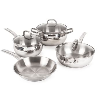 BergHOFF's Belly Shape 7pc cookware set combines elegance with functionality. Crafted from premium 18/10 stainless steel for lasting durability and a stunning mirror finish. The glass lids allow you to keep an eye on your ingredients without allowing essential heat escape from the pot. Each piece are equipped with ergonomic, comfort-grip double-riveted handles and built-in measurement marks, located inside, add convenience and ease of use. Additionally, this cookware set features a 3-layered base bottom for quick and even heat distribution and retention for optimal cooking performance. Compatible with any cooktop including vitro-ceramic, gas, induction, electric, and glass cooktops. Oven safe up to 440°F. From searing, sauteing and frying to making sauces, soups, stocks, this cookware set is perfect for a variety of dishes. Dishwasher safe. Set includes: Fry pan 9.5", Saucepan 8" 3.2qt., Stockpot 9.5" 5.5qt., Deep Skillet 9.5", and 3x glass lids