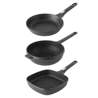 Unlock your cooking creativity with the BergHOFF GEM 3pc stir fry cookware set. This set is an all-in-one solution for stir-frying, searing, grilling, and everyday cooking. Each piece are designed for high performance and healthy results. Crafted from lightweight cast aluminum, these pans distribute heat evenly and quickly for optimal results with less energy. Whether you're tossing veggies in the wok, searing steaks on the grill pan, or flipping pancakes in the fry pan, the PFOA-free FernoGreen nonstick coating allows you to cook with minimal oil and ensures a mess-free release. The detachable stay-cool handle on each piece allows for a seamless transition from stovetop to oven, and makes storage more compact and efficient. Suitable for all stovetops including induction and oven safe up to 464°F (when handle is removed), this sleek set offers the convenience, durability, and performance you need for everyday cooking. Package includes: 10" Fry Pan, 10" Grill Pan, 10" Wok Pan 3qt.