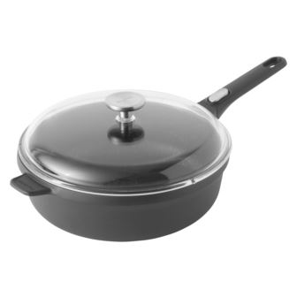 Whether you're making a savory sauce, boiling eggs, or cooking a quick side dish, BergHOFF's GEM 7" saute pan (1.9qt) is your go-to kitchen essential. Designed for convenience, this pan features a detachable stay-cool handle for compact storage, oven versatility, or table serving. Its cast aluminum body heats up fast and evenly for consistent results, while the high quality FernoGreen nonstick coating ensures effortless food release with minimal oil. The tempered glass lid is a true multitasker, allowing you to monitor food without lifting the lid and includes a built-in straining function for easy draining without a colander. The heat-resistant 18/10 stainless steel knob adds safety and durability. Compatible with all major stovetops including induction and oven safe up to 464°F without the handle. This pan offers outstanding everyday performance, healthier cooking, and stress-free cleanup in a compact, versatile design.