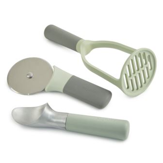 Leo 3pc kitchen tool set is designed with durability and functionality in mind, making meal preparation a breeze. The ice cream scoop features an aluminum head that easily glides through frozen desserts, allowing you to create perfect scoops every time. The pizza cutter boasts a sharp stainless steel blade that effortlessly slices through thick or thin crusts, making pizza night a joy. The potato masher in this set is equipped with a nylon head that is gentle on your cookware while still effectively mashing potatoes, vegetables, and fruits. The ergonomic handles on each tool provide a comfortable grip, reducing hand fatigue during extended use. Whether you're scooping ice cream for dessert, cutting pizza for dinner, or mashing potatoes for a side dish, this versatile set has you covered. The sleek design of each tool adds a touch of modernity to your kitchen decor. Package includes: 7.25" Ice Cream Scoop, 7.5" Pizza Cutter, and 9.25" Potato Masher