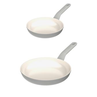 Balance 2pc fry pan set is designed for the eco-conscious home chef. Crafted from recycled aluminum, these fry pans are not only durable and long-lasting, but also contribute to reducing waste and promoting sustainability. The sustainable, non-stick CeraGreen ceramic coating ensures that you can cook with ease while minimizing the need for excess oil or butter, making it a healthier option for you and the environment. Free of PFAS and PTFE, this ceramic coating is nontoxic. Additionally, the soft-touch, ergonomically designed handles provide a comfortable and secure grip, allowing you to maneuver the pans with ease while cooking. Its full disk bottom provides quick and even heat distribution and excellent heat retention. Suitable for any cooktop such as vitro-ceramic, gas, induction, electric, and glass. This set is versatile enough for various cooking tasks, from sautéing vegetables to searing meats. Set includes: 8" Fry pan and 9.5" Fry pan. Available in Moonmist or Sage.