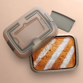 Planning on having a picnic at the park? Due to the lid with fold-away handles for easy carrying and the slicer, this Leo Balance covered cake pan set is your perfect companion! The cake pan itself is made from lightweight carbon steel with a high-quality FernoGreen, PFAS-Free, PTFE-Free, non-stick coating and features grid lines for effortless portioning. The lid is crafted from high-quality PP which is lightweight, foldable handle to lock the cake pan in place while travelling. This set comes with PP matching slicer that you can store on the lid. Constructed from durable carbon steel featuring a diamond-textured surface that increases air flow for even baking and ensures even baking. Wide and ergonomic handles for a safe grip, even when you are wearing oven mitts or using potholders. The Leo carbon steel nonstick bakeware is built to endure high oven temperatures, reaching up to 450°F.