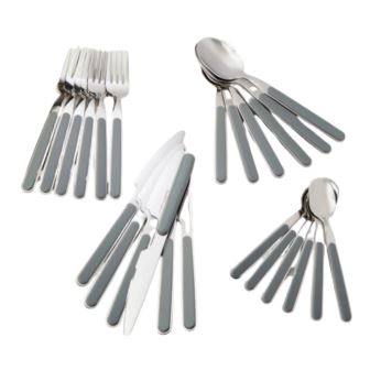 Elevate your dining experience with our Leo Balance 24pc flatware set. Crafted from durable stainless steel, each piece combines sleek design with functionality. The dinner knives glide effortlessly through meals, while the dinner forks and spoons ensure a perfect bite every time. Complete your coffee or tea rituals with the teaspoons. Ergonomically designed ABS handles provide a comfortable grip, making each meal a delight. Perfectly designed to serve up to six people, this flatware set is ideal for family dinners, gatherings, and entertaining guests or even during everyday use or special occasions. This set is a must-have for any modern table setting. Available in Moonmist or Moonbeam. Set includes: 6x Dinner Knives 8.25", 6x Dinner Forks 7.75", 6x Dinner Spoons 7.75", 6x Coffee/teaspoons 5.75"