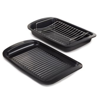 BergHOFF's Leo Graphite 3pc roaster set is built with sustainable and healthy non-toxic, PTFE free, PFAS free non-stick CeraGreen ceramic coating and recycled cast aluminum. Want to bake a great and tasty chicken or small turkey? This set is a must-have. The recycled cast aluminum body and full disk bottom ensure fast, even, and energy efficient heat distribution. Compatible with a wide range of cooktops such as Induction, Electric, Gas, Halogen, and Vitro-ceramic, ovenproof up to 450°F. The ridged base of the grill pan allows fat to escape easily. Versatile cooking surface for grilling and searing food quickly at high temperatures. The removable rack is perfect to roast small turkey, chicken, ham. This roasting pan and grill pan are stackable for easy storage and two-layer cooking. This set includes Teppanyaki Grill Plate 12.75" x 8.25" x 1.5", Roaster 16.5" x 11" x 2.75", and stainless-steel rack 12" x 8.75" x 3".