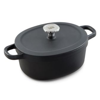 BergHOFF's Leo Graphite oval enameled cast iron 10.75" stockpot 5qt. will help you to create dishes full of flavor! This stockpot is large enough to roast a whole chicken and still leave room for extra garnish. Perfect for your slow cooking recipes and can be transferred from the cooktop to the oven to the table with ease and style. The sturdy cast iron construction ensures that this stockpot will last for years to come, making it a worthwhile investment for any home cook. Braise your meat for a tasty stew or a spicy curry while keeping it nice and juicy thanks to the basting bumps on the inside of the lid. This stockpot provides ample space for a variety of ingredients, suitable with any cooktop such as induction, electric, gas, halogen, and vitro-ceramic. Oven safe up to 535°F.