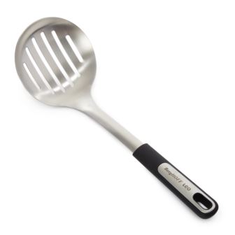 The BergHOFF Leo Graphite stainless steel 13.75" skimmer is an essential tool for draining, lifting, and serving foods with precision and ease. Made from high-quality stainless steel, its generous length offers extended reach and control while keeping your hands safely away from hot liquids. The wide, perforated head efficiently removes foods from boiling water, broth, or oil, making it perfect for pasta, dumplings, or fried items. The ergonomic handle, crafted from recycled polypropylene, ensures a comfortable, non-slip grip, combining eco-conscious design with lasting durability. Lightweight yet sturdy, this skimmer is built for daily use and is dishwasher safe for easy cleanup. With a sleek, modern look and smart functionality, it's a valuable addition to any home kitchen.