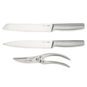 This Leo Legacy 3Pc stainless steel cutlery set is made of high-quality stainless steel that not only stay sharp for a long time but is also very easy to maintain. These static knives have a seamless transition from the stainless steel blade to the matching stainless steel handle. The hollow handle ensures you from a comfortable and ergonomic grip. This poultry shear is a great tool for a variety of kitchen tasks such as cutting poultry into portions, snipping twine, or cutting crabs with minimal effort. The shears' stylish hollow handles ensure a comfortable grip while the stainless steel blades cut through the bones without tearing the delicate meat, provide long-lasting sharpness and are easy to maintain. These knives and poultry shears are part of an all-in1 knife block with integrated knife sharpener and accompanying cutting boards. This set includes Bread Knife 8", Carving Knife 8", and Poultry Shear 9".