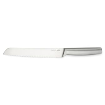 This Leo Legacy bread knife 8" is made of high-quality stainless steel that not only stays sharp for a long time but is also very easy to maintain. This static chef's knife has a seamless transition from the stainless steel blade to the matching stainless steel handle. The hollow handle ensures you from a comfortable and ergonomic grip to cut nice slices of the bread. The bread knife features a serrated blade specially designed for effortlessly slicing through bread and other delicate baked goods with precision and ease. It's also an ideal tool for bread, pastries, tough-skinned fruits, and vegetables, allowing you to peel them without losing too much pulp. This knife is part of an all-in1 knife block with integrated knife sharpener and accompanying cutting boards.