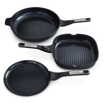 Leo Phantom 3pc cookware set is not only durable but also contribute to a sustainable future. Crafted from recycled cast aluminum and coated with CeraGreen, nonstick ceramic coating ensures effortless cooking and easy cleanup, making these pans a must-have addition to any kitchen. The nonstick, nontoxic PFAS-free and PTFE-free ceramic coating allows you to cook with minimal oil or butter, promoting healthier meals without compromising on taste. The fry and grill pans in this set come with removable handles, providing you with the flexibility to use them in the oven or on the stovetop. The pancake pan in this collection features a stay-cool handle for your safety while flipping those fluffy pancakes. This set is suitable for glass top electric, induction, gas, halogen, and vitro-ceramic cooktops. Oven safe up to 400°F without handles. Whether you're searing a juicy steak or frying up some crispy bacon, these pans deliver exceptional heat distribution for even cooking. Package includes: 12.75" Fry Pan, 10.25" Grill Pan, 10" Pancake Pan