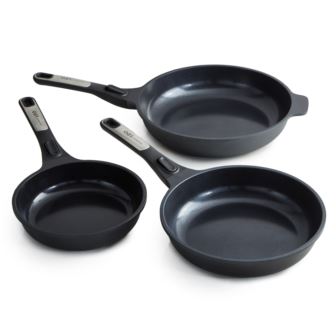 Leo Phantom 3pc frying pan set is crafted with sustainability in mind, this set is perfect for the environmentally conscious home chef who values both style and functionality. Each pan is made from high-quality recycled aluminum, reducing waste and minimizing the impact on the environment. The set includes three different-sized frying pans, ensuring you have the right pan for every cooking need. The pans feature a nonstick CeraGreen ceramic coating that is nontoxic, PFAS-free and PTFE-free, allowing for easy food release and effortless cleaning. The removable stay-cool handles provide a comfortable grip while cooking and can be easily detached for convenient storage or when transferring the pans to the oven. The recycled aluminum construction of these frying pans ensures even heat distribution, suitable for any cooktop such as induction, electric, gas, glass top, and vitro-ceramic, oven use up to 400°F without handles. Whether you're sautéing vegetables, frying eggs, or searing meats, these pans will deliver exceptional results. Package includes: 8" Fry Pan, 9.5" Fry Pan, 11" Fry Pan