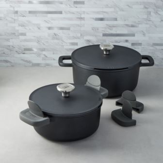 Leo Phantom 4pc cookware set is made with a combination of recycled cast aluminum, layered with CeraGreen non-stick, nontoxic, PFAS-free, PTFE-free ceramic coating ensures that your food cooks evenly and effortlessly, while also being easy to clean. The aluminum lids feature an integrated straining function with condensation bumps underneath to ensure energy-efficient cooking. The stockpots feature wide, double handles that provide a safe and comfortable grip, making it easy to transport from the stove to the table. The lids included in this set help to lock in moisture and flavor, ensuring that your dishes turn out perfectly every time. Full disk bottom ensures fast, even heat distribution and is compatible with glass top electric, induction, gas, halogen, and vitro-ceramic stovetops. Oven safe up to 400°F without handles and silicone sleeves. Whether you're simmering soups, boiling pasta, or making a hearty stew, these stockpots are versatile enough to handle all your cooking needs. Package includes: 10" x 4.5" Stockpot 4.5qt., 11" x 5.25" Stockpot 7.6qt., 2x Lids, 2 pairs of pot holders