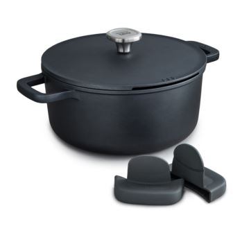Leo Phantom stockpot combines generous capacity with superior heat distribution, making it perfect for preparing hearty soups, stews, and sauces with effortless precision and efficiency. Built with recycled cast aluminum and coated with nontoxic, PFAS-free and PTFE-free, nonstick CeraGreen ceramic coating for easy food release and hassle-free cleanup. Designed for oil-free, fat-free cooking, this lightweight stockpot is suitable for all stovetops, including induction, electric, gas, glass, and vitro-ceramic. Its full disk bottom ensures even heat distribution for energy-efficient performance, and the pot is oven-safe up to 400°F without silicone covers. The wide handles provide a secure grip, even with oven mitts or potholders, while the matching cover features condensation bumps for self-basting and draining holes for easy straining. The set includes two pot holders for added safety. Available in 4 sizes: 2.7qt., 4.5qt., 5.8qt. and 7.6qt.