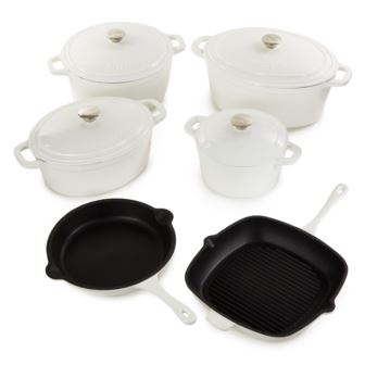 Neo 10pc Cast Iron cookware set is a modern collection that marries function, design and innovative use of materials to create an outstanding line of cast iron cookware. Coated with an enamel layer for a smooth, hygienic surface. The dutch ovens are ideal for slow cooking, braising or baking. Cook like a pro with the versatile dutch oven that can go effortlessly from browning on the stove top to roasting in the oven. Braise short ribs, make hearty stew, three bean chili, curry chicken, and so much more. The grill and fry pan are equipped with a helper handle and two pour spouts, making it easy to maneuver and pour out liquids without any spills or accidents. Versatility is key with this cookware set, as it is compatible with a wide range of cooktops including induction, electric, gas, halogen, and vitro-ceramic. Oven safe up to 535°F. Whether you're a professional chef or a home cook, these pans will meet all your cooking needs. Set includes: 10" Fry Pan, 11" Square Grill Pan, 8" Round Dutch Oven 3qt, 11.5" Oval Dutch Oven 5qt, 11" Round Dutch Oven 7qt, 13" Oval Dutch Oven 8qt, 4x Lids