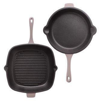 Neo 2pc fry and grill pan cookware set is a must-have addition to any kitchen. This set features a glossy enamel coating for a sleek, stylish appearance and a smooth, non-porous surface that is both non-absorbent and hygienic. The grill pan's ridged surface adds a delightful sear to your foods, while both pans include convenient helper handles and two pour spouts for easy drainage. Effortlessly cook breakfast favorites like eggs and pancakes in the fry pan and use the grill pan for perfectly seared steaks, grilled vegetables, and flavorful fish fillets. This set is designed to provide even heat distribution and retention, ensuring energy-efficient cooking across all heat sources, including induction, electric, gas, halogen, and vitro-ceramic. Oven safe up to 535°F. Set includes: 10" Fry pan and 11" Grill pan. Available in 9 colors: Blue, Green, Meringue, Orange, Oyster, Pink, Purple, Red, White