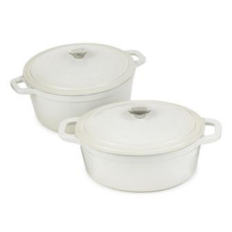 Neo Cast Iron Round and Oval Dutch Oven Set is a versatile and durable cooking essential for every kitchen. This dutch oven is crafted with high-quality cast iron and features an enameled coating both on the interior and exterior. The enameled coating is non-porous and non-absorbent, ensuring easy clean up after each use. Say goodbye to the hassle of preseasoning, as this dutch oven is ready to use straight out of the box. Its vapor seal lid allows for waterless cooking. This innovative design helps to retain moisture and flavors, resulting in delicious and tender meals. Whether you're simmering a hearty stew or slow-cooking a succulent roast, this dutch oven will deliver exceptional results every time. Prepare for a large gathering or with friends and family given these dutch oven's 5qt and 7qt ample cooking space. Suitable with a wide range of cooktops, including induction, electric, gas, halogen, and vitro-ceramic. Oven safe up to 535°F. Set includes: 5qt Oval Dutch Oven, 7qt Round Dutch Oven, 2x Lids