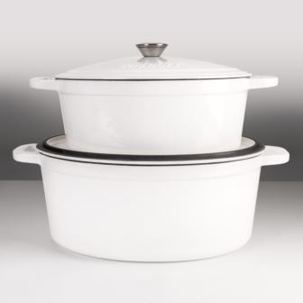 Neo 4pc enameled cast iron Dutch oven set is built to last for years to come. Crafted from durable cast iron with an enameled body this cookware heats up evenly and stays hot longer. The ergonomic handles provide a secure grip. Cook like a pro with the versatile dutch oven that can go effortlessly from browning on the stove top to roasting in the oven. Braise short ribs, make hearty stew, three bean chili, curry chicken, and so much more. Our cast iron cookware set is suitable for all cooktops including gas, electric, ceramic, glass, and induction. Oven safe up to 535°F. You can sear your food on the stovetop, and finish in the oven. Set includes: 13" Oval Dutch Oven 8qt, 11.5" Oval Dutch Oven 5qt, 2x Lids. Available in 9 colors: Blue, Green, Meringue, Orange, Oyster, Pink, Purple, Red, White