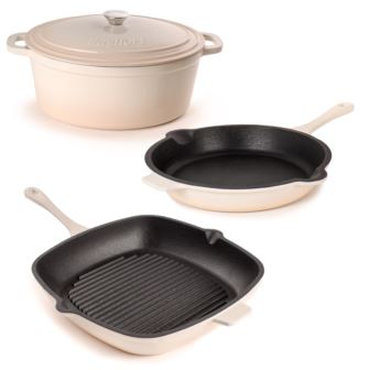 Neo 4pc cookware set combines style and functionality for all your cooking needs. Each piece is crafted from high quality cast iron and features a durable enameled body, eliminating the need for preseasoning and ensuring easy maintenance. The fry pan and grill pan are designed with helper handles and pour spouts to easily transfer and drain your dishes. Use the grill pan to create homemade paninis, meaty steaks and chicken breasts with perfect grill marks or make succulent lamb chops, crispy bacon, and even a delicious cake with the fry pan. The Dutch oven comes with a vapor seal lid, enhancing its versatility for simmering, braising, and roasting. Compatible with all cooktops such as gas, electric, ceramic, glass, and induction and oven-safe up to 535°F. Set includes: 10" Fry Pan, 11" Square Grill Pan, 5qt Oval Dutch Oven with Lid. Available in 9 colors: Blue, Green, Meringue, Orange, Oyster, Pink, Purple, Red, White