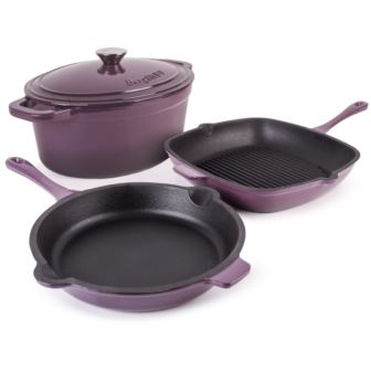 BergHOFF - Neo 4pc Cast Iron Cookware Set, Grill Pan, Fry Pan & Oval Dutch Oven, Purple