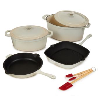Neo 9pc Cast Iron Cookware with Silicone Spatulas Set is a modern collection that marries function, design and innovative use of materials to create an outstanding line of cast iron cookware. Coated with an enamel layer for a smooth, hygienic surface. The cast iron dutch ovens are ideal for slow cooking stews, braising, baking and so much more. Cook like a pro with the versatile dutch oven that can go effortlessly from browning on the stove top to roasting in the oven. Braise short ribs, make hearty stew, three bean chili, curry chicken, and so much more. The grill and fry pan are equipped with a helper handle and two pour spouts, making it easy to maneuver and pour out liquids without any spills or accidents. Utilize the silicone spatulas without scratching or damaging your cookware's surface. The enameled cookware set is suitable for all heat sources including, gas, electric, induction and ceramic. Oven safe up to 535°F. Set includes: Silicone 3pc Spatula Set, 8qt Oval Dutch Oven, 5qt Oval Dutch Oven, 10" Fry Pan, 11" Square Grill Pan, 2x Lids