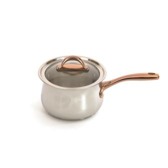 Ouro Gold 6.25" Saucepan 2.5qt. with glass lid is crafted from high-quality, durable 18/10 stainless steel, combining sustainable design with top-notch performance. The saucepan features elegant rose gold handles for a secure and comfortable grip. Its 3-layered base ensures efficient heat distribution, while the glass lid allows you to monitor your cooking without lifting the lid, helping to retain moisture and flavor. Whether you need to simmer sauces, boil vegetables, or even make soups or stew, this saucepan is designed to meet all your culinary needs. Suitable for all cooktops, including Induction, Electric, Gas, Halogen, Glass Top and Vitro-ceramic, this eco-friendly saucepan delivers energy-efficient cooking and versatility for a wide range of dishes. Hand wash only.