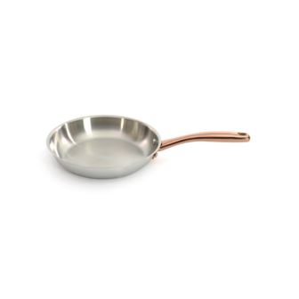Ouro Gold 9.5" Fry Pan is an indispensable kitchen essential, crafted from durable 18/10 stainless steel to resist warping and denting with regular use. Designed for ease of use, this fry pan features ergonomic rose gold handles that ensure a secure, comfortable grip, enhancing safety and control while cooking. Perfect for tasks like flipping pancakes or sautéing vegetables, it provides a reliable and controlled cooking experience. Its multi-layered base ensures even heat distribution so that your food is cooked evenly and thoroughly. Whether you have an Induction, Electric, Gas, Halogen, Glass Top, Vitro-ceramic Stove, this fry pan is the perfect addition to your kitchen. The pan's smooth surface facilitates effortless food release and quick clean-up, eliminating the need for extensive scrubbing. With its sleek, modern design, this fry pan not only performs exceptionally but also adds a touch of sophistication to your kitchen. Hand wash only. Available in 2 sizes: 8" and 9.5"