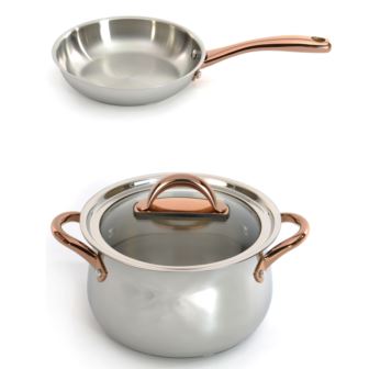 This Ouro Gold 3pc starter set seamlessly combines style, durability, and functionality for contemporary kitchens. Made from high-quality, durable 18/10 stainless steel, this eco-friendly and sustainable set features stylish rose gold handles for a comfortable, secure grip. The stockpot includes a glass lid designed to lock in heat and moisture, enabling efficient waterless cooking that preserves nutrients and enhances flavors. Prepare a variety of dishes, from nutrient-rich steamed vegetables and tender braised meats to rich soups and stews, all while benefiting from energy-efficient performance. The 3-layered base provides even heat distribution across multiple cooktops, including induction, electric, gas, halogen, glass top, and vitro-ceramic. Combining practical functionality with a sleek, elegant design, this set is a must-have for both efficient and eco-conscious cooking. Package includes: Frying Pan 8", 9.5" Stockpot 8.1qt., and glass lid