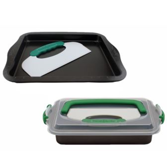 Perfect Slice 5pc Bakeware set is the perfect set for all your baking needs. These baking essentials are designed to provide even heat distribution for perfectly baked goods every time. The non-stick coating ensures easy release of your creations, making clean-up a breeze. The unique patented guideline grid around the outer edges of every pan allows you to simply line up the Perfect Slice cutting tool, and press down to create any portion size desired. Every slice is beautifully uniform. The cutting tool with silicone handle is tough enough to cut the cake yet won't damage your pan. Whether you're slicing through a freshly baked cake or cutting perfect cookie bars, these slicer tools will make your baking experience a breeze. Oven safe up to 425°F. Package includes: 14" x 11" Cookie Sheet, 9" x 13" Cake Pan with Cover, 2x Slicer tool