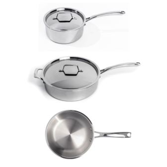 BergHOFF's Professional 5pc cookware set combines exceptional versatility and high-end design for everyday use. Featuring tri-ply construction, each piece is crafted with an aluminum core sandwiched between layers of 18/10 stainless steel and magnetic stainless steel, ensuring rapid and even heat distribution on all sides. The high-quality 18/10 stainless steel, along with a three-layer capsule base, offers energy efficiency and consistent cooking results. Each pot and pan includes a heavy-gauge, deep-seated stainless steel lid that seals in heat and moisture while providing a sleek, professional appearance. Convenient internal capacity markings aid in portion control for healthier meals. With elegant dual-riveted stainless steel handles, this set is compatible with all heat sources, including induction, electric, gas, halogen, and vitro-ceramic. Oven safe up to 440°F. Dishwasher safe. Set includes: 10" Fry pan, 8" Saucepan 3qt., 11" Sauté Pan 4.5qt., and 2x lids