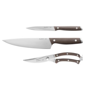 Peeling, slicing, dicing, chopping and cutting, with this multifunctional knife set, you've got all the tools for the job! Razor-sharp stainless steel blades with a satin finish. The high-quality stainless steel blade of the utility knife, chef's knife, and poultry shears effortlessly slide through your meat, fish, poultry, fruit, and vegetables while the crack-resistant wooden handle fits comfortably in your hand for a secure grip and gives each knife a unique character that instantly adds a touch of authenticity to your kitchen. Easy to clean. Set comes with 1x chef's knife, 1x utility knife, 1x poultry shears