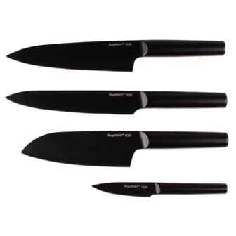 Ron 4pc Black Knife Set are a unique combination of classic craftsmanship with a modern flare. Set includes one paring knife, one chef knife, one santoku knife and one carving knife. Beautifully crafted from chromo stainless steel for durability, these knifes are rust and corrosion resistant, with the added benefit of a two layer titanium PVD (PFAS free, non-toxic) nonstick coating with a matte black finish. Ergonomic handles keep the knives well balanced for extra control and a secure grip. The seamless fluidity of our Ron knives add to it's hygienic properties keeping food particles from getting caught in small openings. Perfect for both professional and everyday home use. Multi-purpose knife set provides for greater precision with a slight curvature for ease of movement while slicing, chopping, dicing, carving, peeling, and more. Easy to clean; handwash recommended with warm water and mild detergent. Package includes: Chef's Knife 7.5", Santoku Knife 6.25", Carving Knife 6.75", and Paring Knife 3.25".