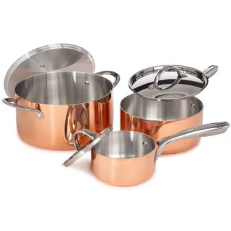 Vintage 6pc copper cookware set is designed to provide uniform heating throughout its tri-ply layered body. The vintage polished-design of this cookware set exudes elegance and sophistication. The tri-ply construction, made of 18/10 stainless steel interior, aluminum core and copper exterior, ensures even heat distribution, allowing you to achieve perfect cooking results every time. Each piece in this set features a comfortable handle that stays cool to the touch, allowing for safe and easy handling. The lids are made of stainless steel, allowing you to retain moisture, texture and nutrients. The saucepan is perfect for simmering sauces or cooking small portions of food, while the stockpot is ideal for making soups, stews, or boiling pasta. The set is suitable for all stovetops, electric, gas, halogen, and vitro-ceramic. Oven safe 450°F. Set includes 5.5" saucepan 1qt., 8" saucepan 3qt., 9.5" stockpot 5.75qt, 3x lids.