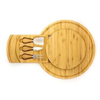 If you love to host, this set is made for you. Featuring a slide out tray to hold the 3 included knives, this set helps you create the perfect meat and cheese platter. The beautiful bamboo adds varitaion so no two are alike. This beautiful bamboo wood entertainer has a generous serving area combined with a high capacity curved cracker well around the entire board.