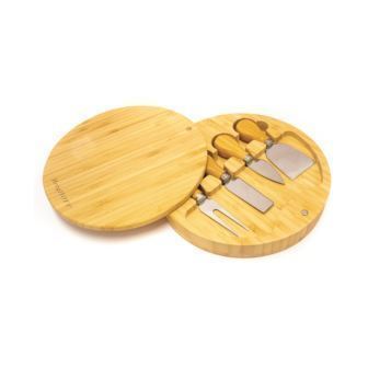 Great addition to any home, this circular bamboo plate has a multi-functional space efficient design. To open, the top swivels out revealing hidden compartment that holds four different cheese knives with stainless steel blades. Hold fruit or cheese on top for an eye catching centerpiece.