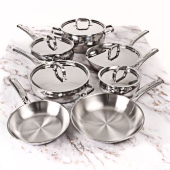 BergHOFF's 18/10 Stainless Steel Belly Cookware Collection, elegant beauty that will last for years. Crafted from hygienic 18/10 stainless steel with a mirrored finish. The Belly 12pc Cookware Set includes 1x 8" fry pan, 1x 9.5" fry pan, 1x 6.25"/1.5qt covered sauce pan, 1x 8"/3.2qt covered sauce pan, 1x 9.5"/5.5qt covered stock pot, 1x 9.5" covered deep skillet, 1x 10.5"/2.5qt covered skillet. Tri-ply base for use on all cooktops including ceramic, gas, induction, electric, and glass. Please allow cookware to cool completely before attempting to clean.