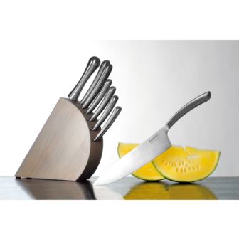Versatile set with a knife for each cooking task. The modern look is sure to add a designer touch to any kitchen décor. This set includes 4.75" utility knife, 6" utility knife, 6" boning knife, 9" chef's knife, 9"bread knife, 9" sharpening steel, 1 wooden block.