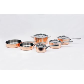 Vintage 10pc hammered tri-ply copper cookware set, a true masterpiece that will undoubtedly become the centerpiece of your kitchen. Crafted with a unique design, this set is crafted with durable hammered copper exterior with aluminum alloy core & surgical grade stainless steel interior. The tri-ply construction of this cookware ensures even heat distribution, making it perfect for all your culinary creations. The ergonomic, comfort-grip handles make it easy to maneuver the pots and pans, while the hammered design adds a touch of sophistication to your kitchen decor. Whether you are a professional chef or a passionate home cook, this hammered copper cookware set is a must-have for those who appreciate both style and functionality in their kitchen. Elevate your cooking experience and impress your guests with this exceptional cookware set that combines artistry and performance seamlessly. Whether you're sautéing, simmering, or searing, this versatile cookware set has you covered, suitable for Electric, Gas, Halogen, and Vitro-ceramic. Oven safe 450°F. Hand wash recommended. Set includes 5.5" saucepan 1qt., 7" sauce pan 2qt., 8" sauce pan 3qt., 9.5" stockpot 5.75qt., 8" & 9.5" deep skillet with 4x lids.