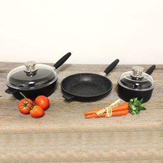EuroCAST by BergHOFF is a premium cookware line featuring an eco-friendly and toxin-free non-stick cooking surface. One of the lightest cast pans on the market, it's heavy-duty construction stands up to constant and rigorous use without warping and chipping.With a proprietary ceramic blend cooking surface and ferrous bottom plate, heat is distributed quickly and evenly and can be used on any cooking surface, including induction. Removable handles create oven-safe vessels for fully functional and versatile cookware with easy storage. Items included: 10" Saute Pan, 10" High-sided Saute Pan, , 1 1/2 Qt Sauce Pan.