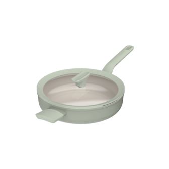 Leo Balance Sauté Pan 10.25", 3.1qt. is built with sustainable and healthy non-toxic, PTFE free, PFAS free non-stick CeraGreen ceramic coating, 100% recycled aluminum and stay-cool handle for no oil, no fat cooking, suitable for all types of stoves. The Aluminum body and flat disk bottom ensure fast, even, and energy efficient heat distribution. It features a long and stay-cool handle that's soft to the touch and provides a safe and comfortable grip. The glass lid is equipped with a spoon rest function to keep your kitchen clean while cooking. So, whether you're in the mood for some risotto, paella, or sautéed veggies, just place your ingredients in the pan and keep an eye on your food through the clear glass lid that helps you to cook energy efficiently and features a drain hole for effortless straining. The matching colors Moonmist and Sage in this Leo collection allow you to combine the different sizes of pots and pans in both colors.