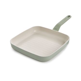 Leo Balance square grill pan 10" is built with sustainable and healthy non-toxic, PTFE free, PFAS free non-stick CeraGreen ceramic coating, recycled aluminum and stay-cool handle for no oil, no fat cooking, suitable for all types of stoves. Whether you're in the mood for a delicious steak, grilled asparagus, or a piece of salmon, with this 100% recycled Aluminum grill pan you have all you need to grill your food to perfection on any kind of stovetop, including induction. The raised grill lines gives your food those typical grill marks and allow fat and moisture to escape for an extra crispy result. Its aluminum body and flat disk bottom ensure fast and even heat distribution. The non-stick coating provides easy food release as well as a quick clean-up and a stay-cool handle for a comfortable and safe grip. The matching colors Moonmist and Sage in this Leo collection allow you to combine the different sizes of pots and pans in both colors.