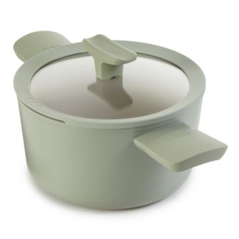Leo Balance Stockpot 8", 3.3qt. is built with sustainable and healthy non-toxic, PTFE free, PFAS free non-stick CeraGreen ceramic coating, 100% recycled aluminum and stay-cool handle for no oil, no fat cooking, suitable for all types of stoves. The body material and flat disk bottom ensures fast and even heat distribution on any stovetop, including induction, while the clear glass lid with drain hole for easy straining allows you to keep an eye on your food without having to lift the lid while the integrated spoon rest function on the lid keeps your cooktop and table clean while cooking or serving dinner. When you've finished cooking, just grab the stay-cool handles, and easily take the stockpot to the table to serve up your latest culinary creation. The matching colors Moonmist and Sage in this Leo collection allow you to combine the different sizes of pots and pans in both colors.