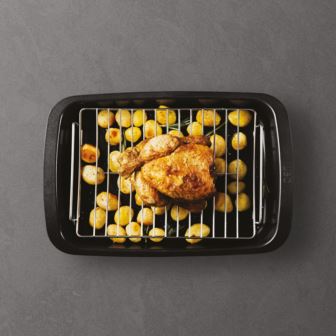 Leo Graphite 2Pc Roaster Set is built with sustainable and healthy non-toxic, PTFE free, PFAS free non-stick CeraGreen ceramic coating, recycled cast aluminum for no oil, no fat cooking, suitable for all types of stoves. The recycled cast aluminum body and full disk bottom ensure fast, even, and energy efficient heat distribution and ovenproof up to 230°C (450°F). The matching stainless steel rack is perfect for baking small turkey, ham, chicken. Wide handles for a safe grip, even when you are wearing oven mitts or using potholders. This set is stackable with Leo Graphite grill pan for easy storage and two-layer cooking. An added bonus is the seamless construction between the aluminum body and the handle for extra hygiene. Explore our Leo collection for an extensive array of pots and pans, available in various materials and sizes. This set includes Roaster 16.5" x 11" x 2.75", and stainless-steel rack 12" x 8.75" x 3"