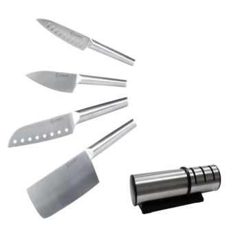 These knives are made of high quality stainless steel and feature stylish stainless steel handles. Easily sharpened and holds their edge well. The handle is safe, high impact, slip resistant as well as antimicrobial and micro-organism safe. Set includes: (7") Santoku knife with holes, (5")Santoku knife grooved, (4 1/2") Santoku knife, (7" x 3 1/2") cleaver. This set also includes a 19" Stainless steel sharpening steel for your knife set. Always use a high quality steel by BergHOFF for your top quality knives.