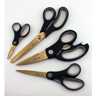 4 Piece Scissors Set has ergonomically designed handles for safe handling with titanium gold-toned coated stainless steel for durability and easy cleaning in any kitchen.