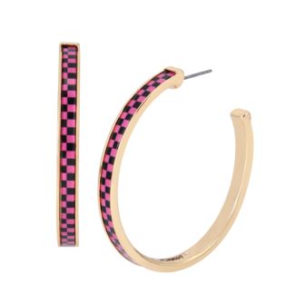 Sleek open hoop earrings adorned with playful pink checkerboard motif. Earrings have a post back closure. Approximate drop: 1-3/4 inches