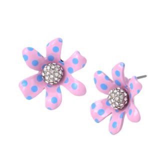 Pink polka dot flower stud earrings adorned with crystal pave at center. These colorful earrings are set in polished gold-tone metal and have a post back closure.