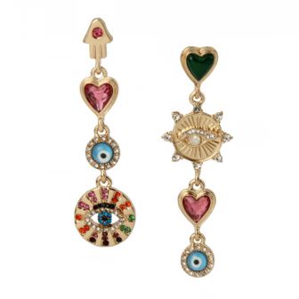 Mismatched linear earrings featuring mystical evil eye coins, green cabochon heart, pink stone hearts, evil eye beads with haloed crystal stones and Hamsa. Earrings have a post back closure.